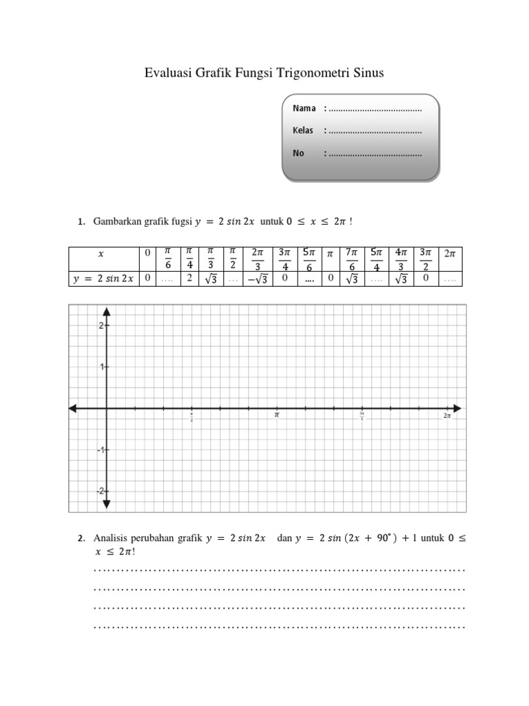 Tabel Y = 2 Sin X - Virlina To Green Grafik Dari Fungsi Trigonometri Berbentuk Kurva Periodik Hal Ini Dapat Dibuktikan Dengan Bantuan Turunan Tidak Dibuktikan Di Sini Untuk Fungsi Sinus Dan Cosinus Grafiknya Memiliki Nilai Maksimum Dan Minimum : Check spelling or type a new query.. Check spelling or type a new query. We did not find results for: Maybe you would like to learn more about one of these? Tabel y = 2 sin x.